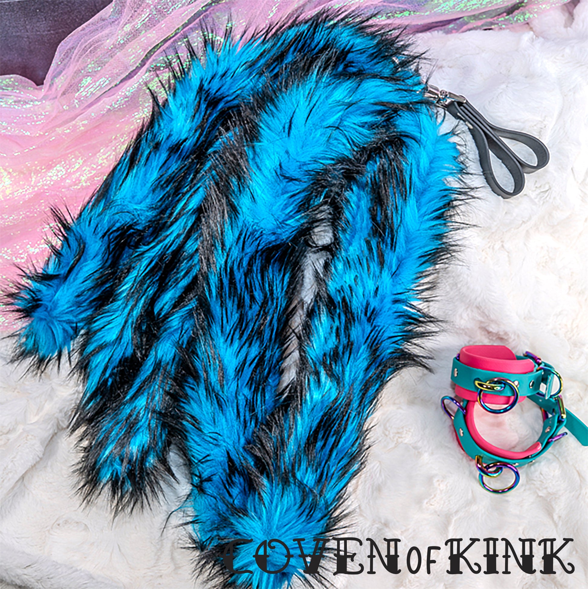🌌✨ Make a bold statement with the 'Electric Sway' Weighted Faux Fur Flogger. This stunning flogger features long, shaggy electric blue faux fur with black tips, giving it a silky and luxurious feel. Each of the 8 tails is carefully weighted with poly pellets to provide a soft yet thuddy sensation, perfect for a sensory-rich experience.