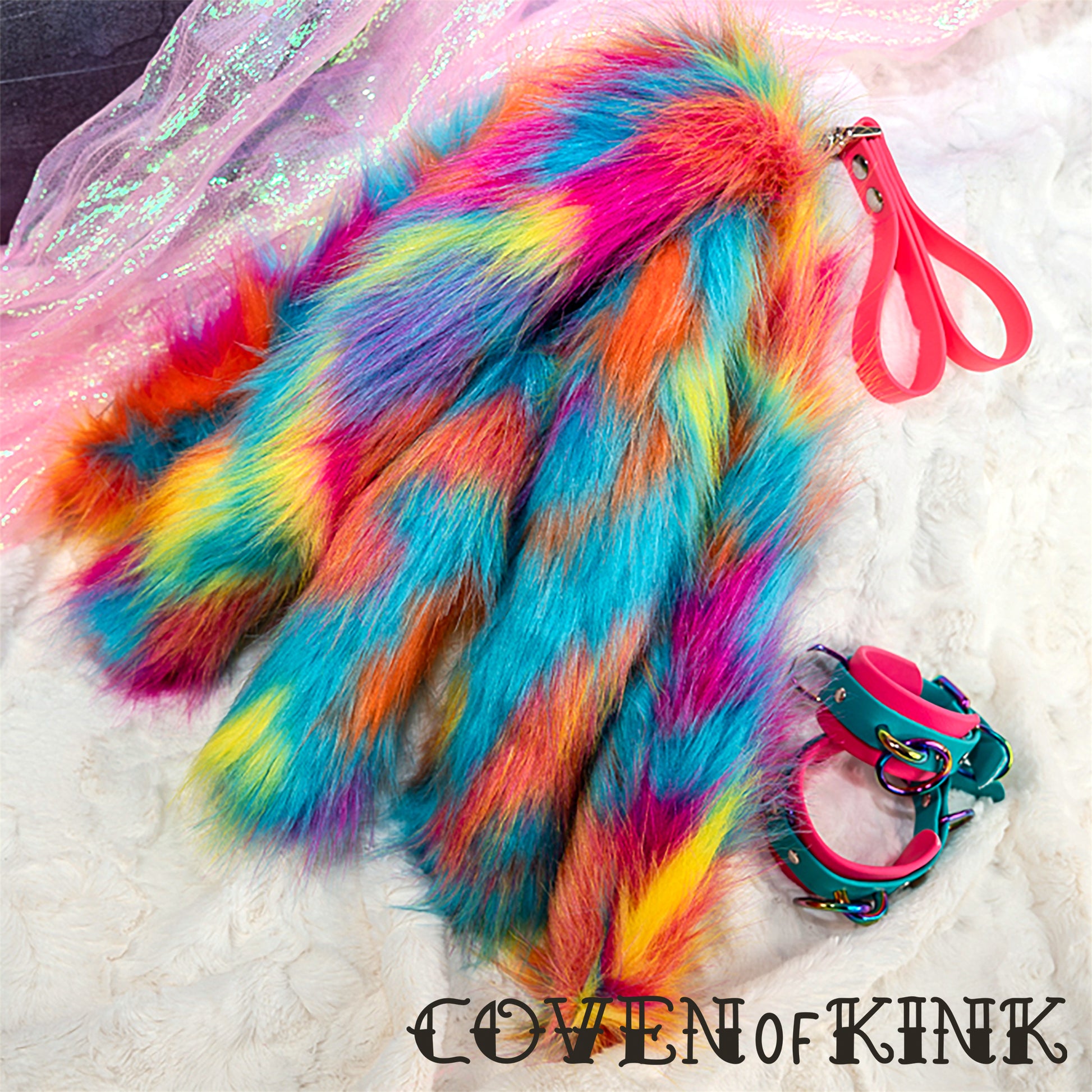 Dive into a spectrum of sensations with the Neon Mayhem Weighted Faux Fur Flogger. Adorned with a vivid mix of hot pink, yellow, electric blue, purple, and orange, this flogger is a visual and tactile feast. The weighted tails offer a plush, thuddy feel, making each stroke a vibrant and soft encounter.